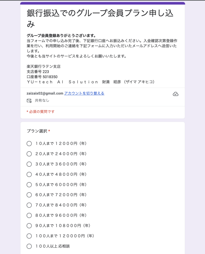 銀行振り込みの場合は、下記お問い合わせフォームでご連絡ください。(10人から対応しています)