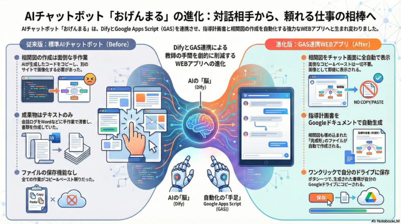 そこで今回は、Google Apps Script (GAS) を活用してDifyと連携させ、**「会話するだけで、相関図入りの指導計画書(Googleドキュメント)が完成するWEBアプリ」**へと進化させました。