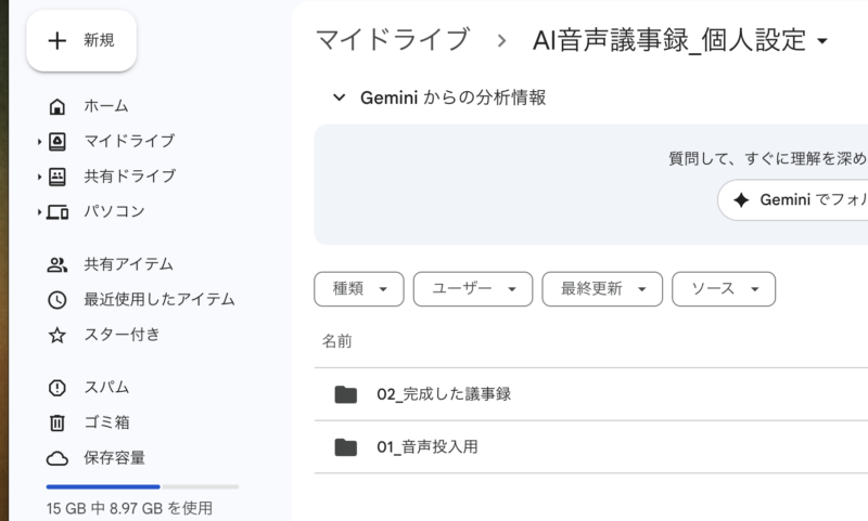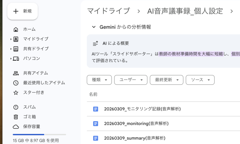 - 保存(移動中に): 録音が終わったら、その場でGoogleドライブの専用フォルダへ保存。