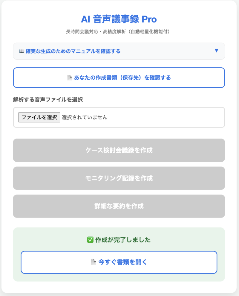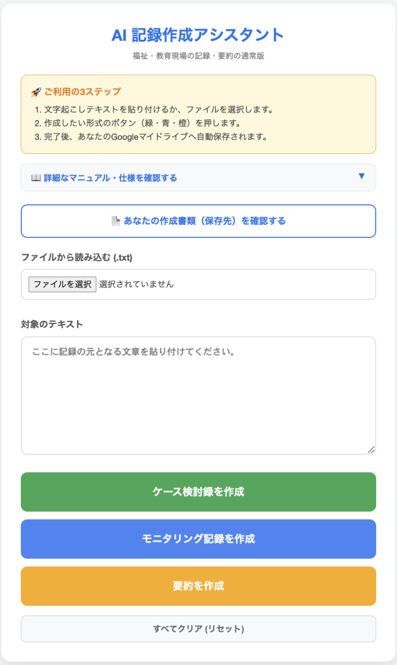 こうした悩みを抱える皆様のために、「文字を打つ・音声を聴き直す」という作業を、「AIが書いた下書きを確認・修正する」という5分の工程に変えるための専用ツールを開発しました。