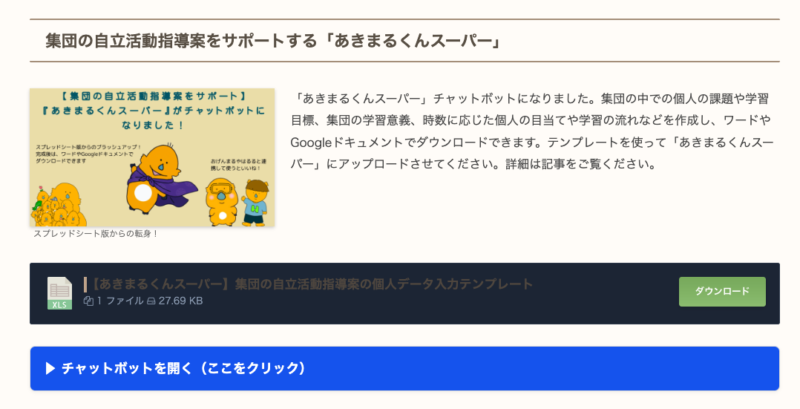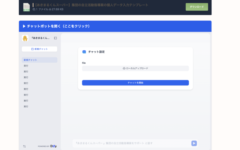 チャットボットの上にダウンロードボタンがありますのでテンプレートをダウンロードしてお使いください。