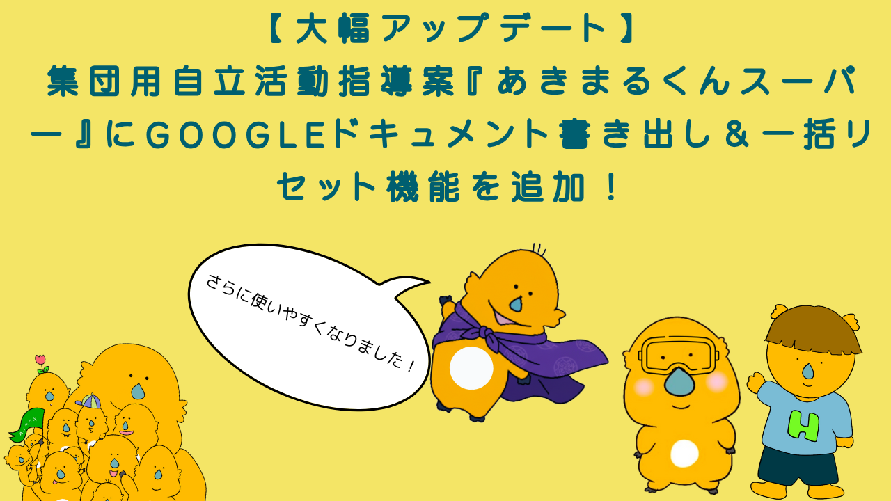先日公開させていただいた**【集団】自立活動指導案サポート「あきまるくんスーパー」**ですが、おかげさまでご好評の声をいただき、大変嬉しく思っております。