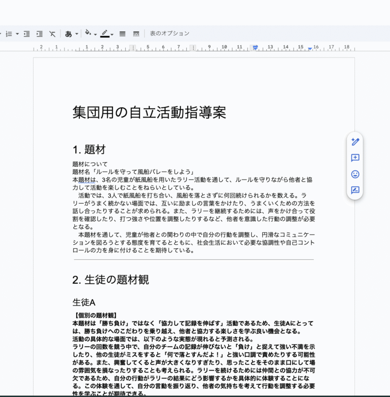 スプレッドシート上で生成したすべての指導案要素