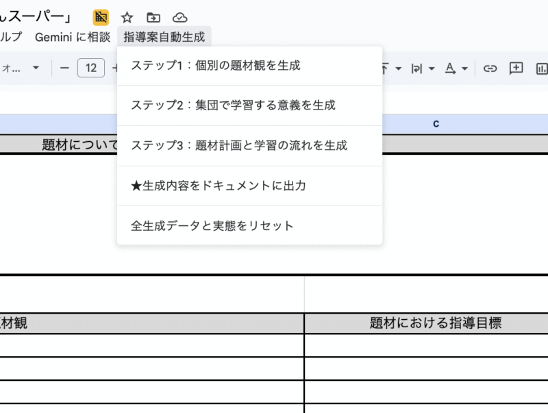 これまで通りステップ1〜3で指導案を生成した後、メニューから**「★生成内容をドキュメントに出力」**をクリックするだけ!