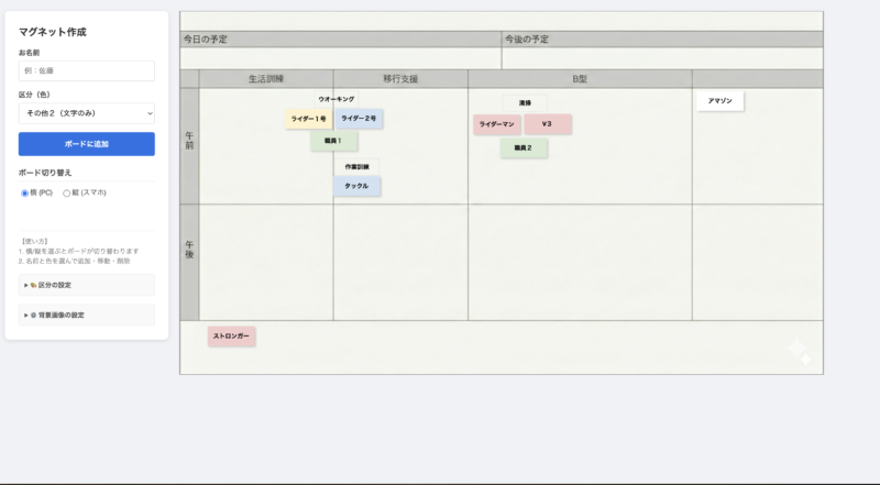 - 建設業の作業員配置: 「A現場」「B現場」の枠に、職人さんのマグネットを配置。誰がどこに向かっているかを一括管理。