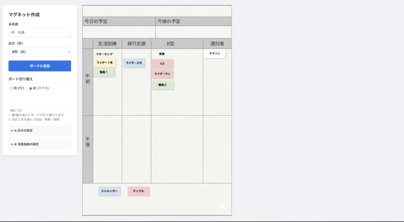 これにより、単なる支援施設用ツールから、あらゆる現場の「配置ボード」として使える汎用SaaSレベルのアプリへと進化を遂げました。