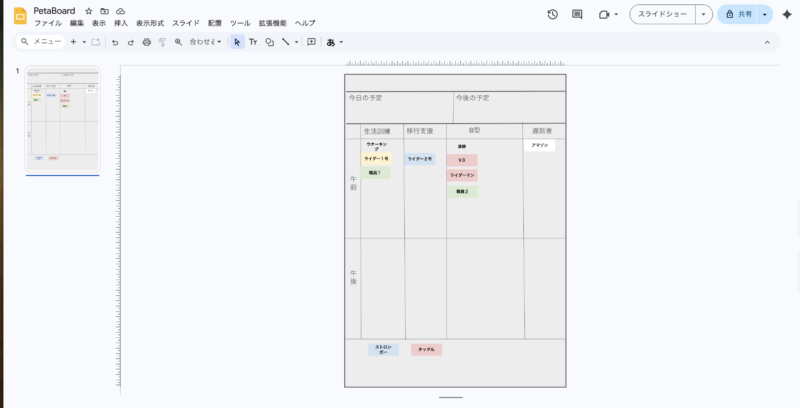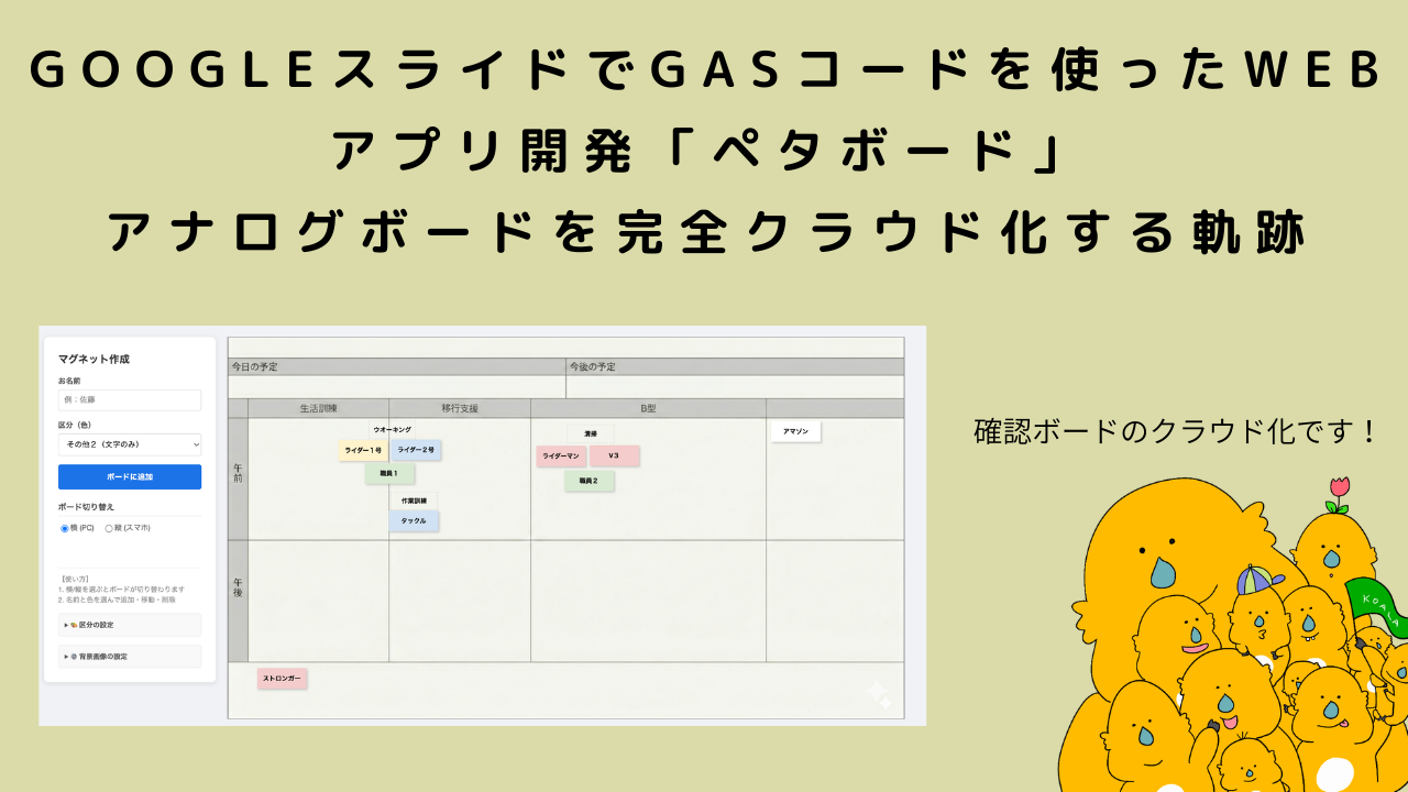 「ペタボード (PetaBoard)」は、大掛かりなシステム開発を行わずとも、Google Workspaceの標準機能(GASとスライド)を組み合わせるだけで、ここまで現場にフィットした実用的なアプリケーションが作れるという証明でもあります。
