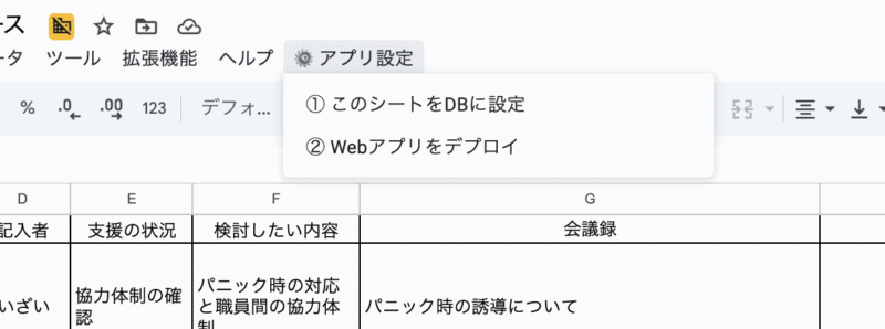 コピーして開いたスプレッドシートの上部に、**「⚙️ アプリ設定」**という専用メニューが表示されます。