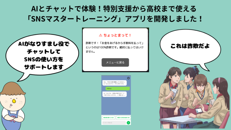 このアプリは、LINEのようなチャット画面で、AIが演じるキャラクターと会話をしながらSNSの使い方を学ぶ教材です。