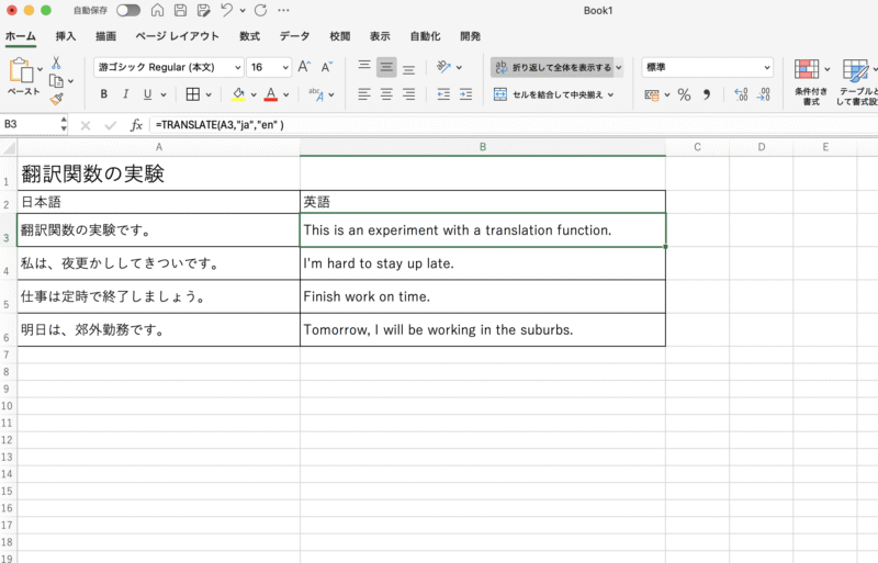 たとえば「セル A3 の日本語を英語に翻訳する」場合は、次のように記述します。