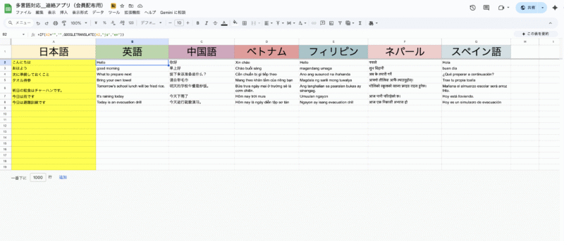 左はエクセル、右はスプレッドシートです。Aセルの日本語を翻訳した様子です。(スプレッドシートは多国籍の生徒が複数いる場合を想定して作成しています。詳しくは↓)。