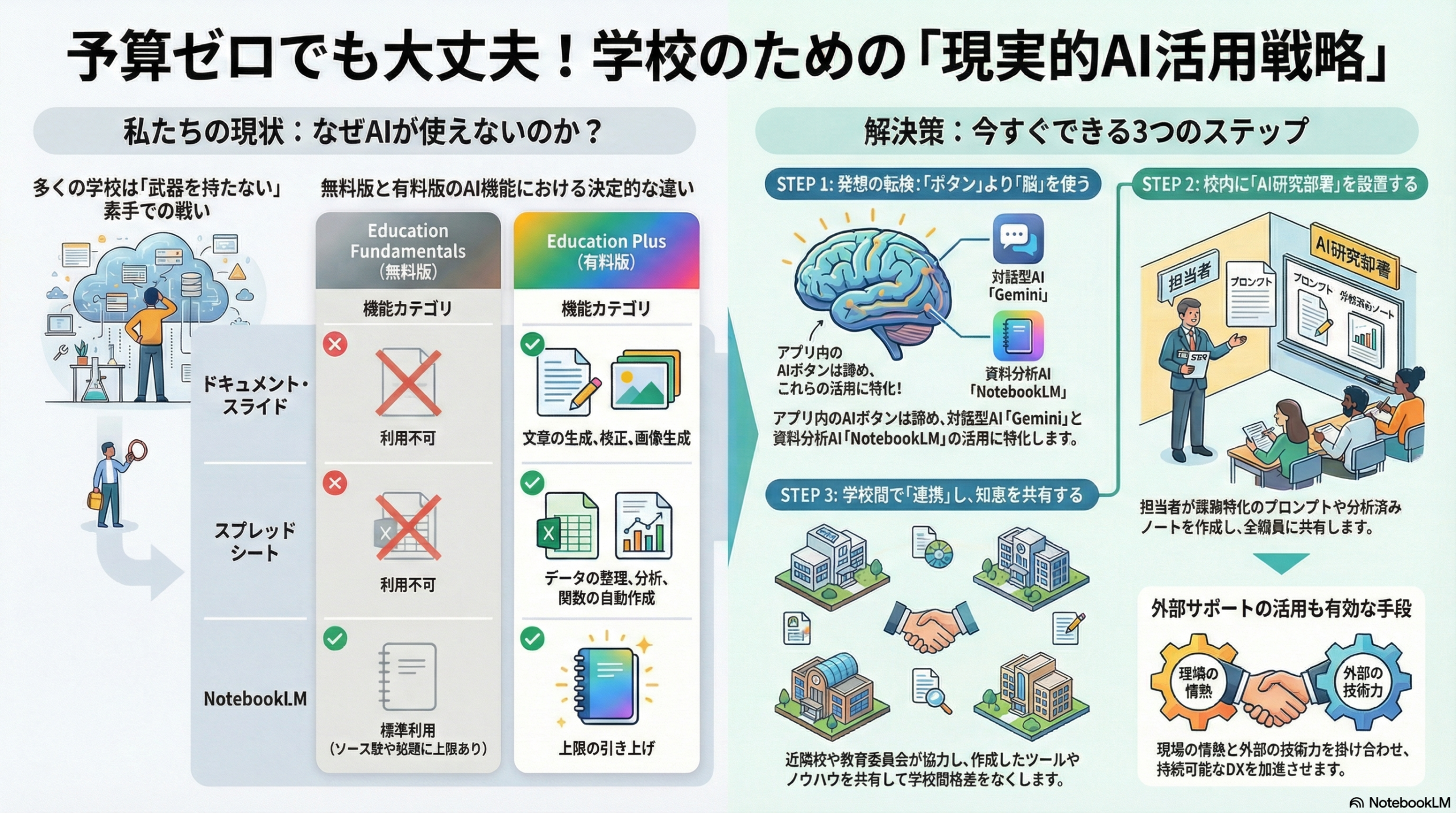 それもそのはず。日本の公立学校の多くは現在**「無料版(Education Fundamentals)」で運用されており、AI機能については、私たちは、いわば「武器を持たずに素手で戦っている状態」**なのです。