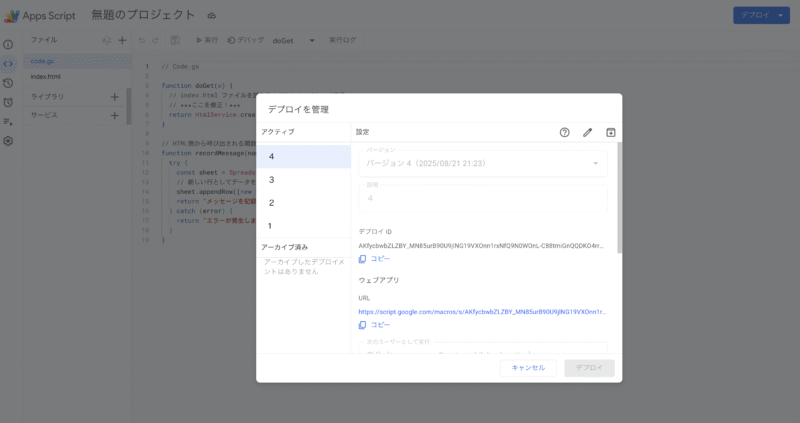 Code.gs ファイル全体が以下のようになっていることを確認してください。codeJavaScript