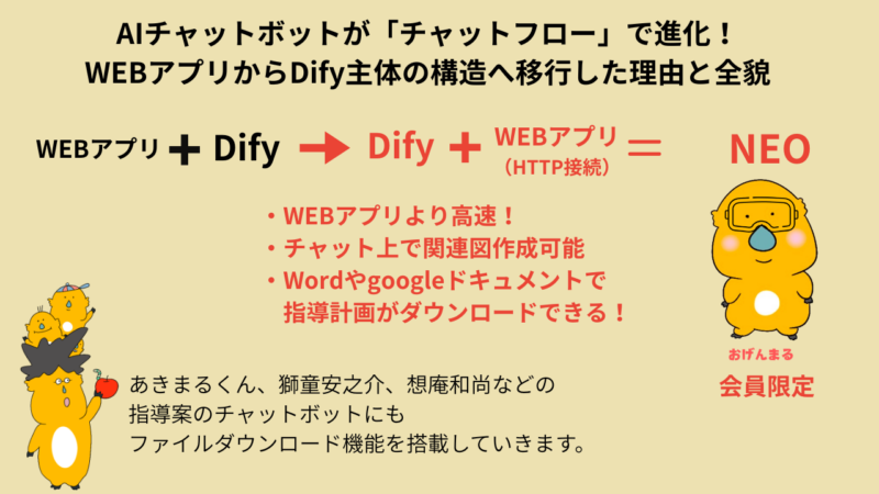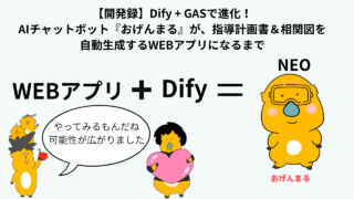先日(2025/12/14)公開し、会員の皆様にご利用いただいていた「おげんまるNeo」は、Google Apps Script(GAS)で作成したWebアプリを窓口にし、裏側でDifyのAPIを呼び出す仕組みでした。