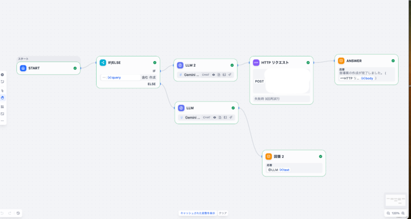 通常の「AIチャットボット」モードではなく、処理の流れをブロックで組む「フロー」モードを採用しました。ここでいくつかの技術的な工夫を行っています。