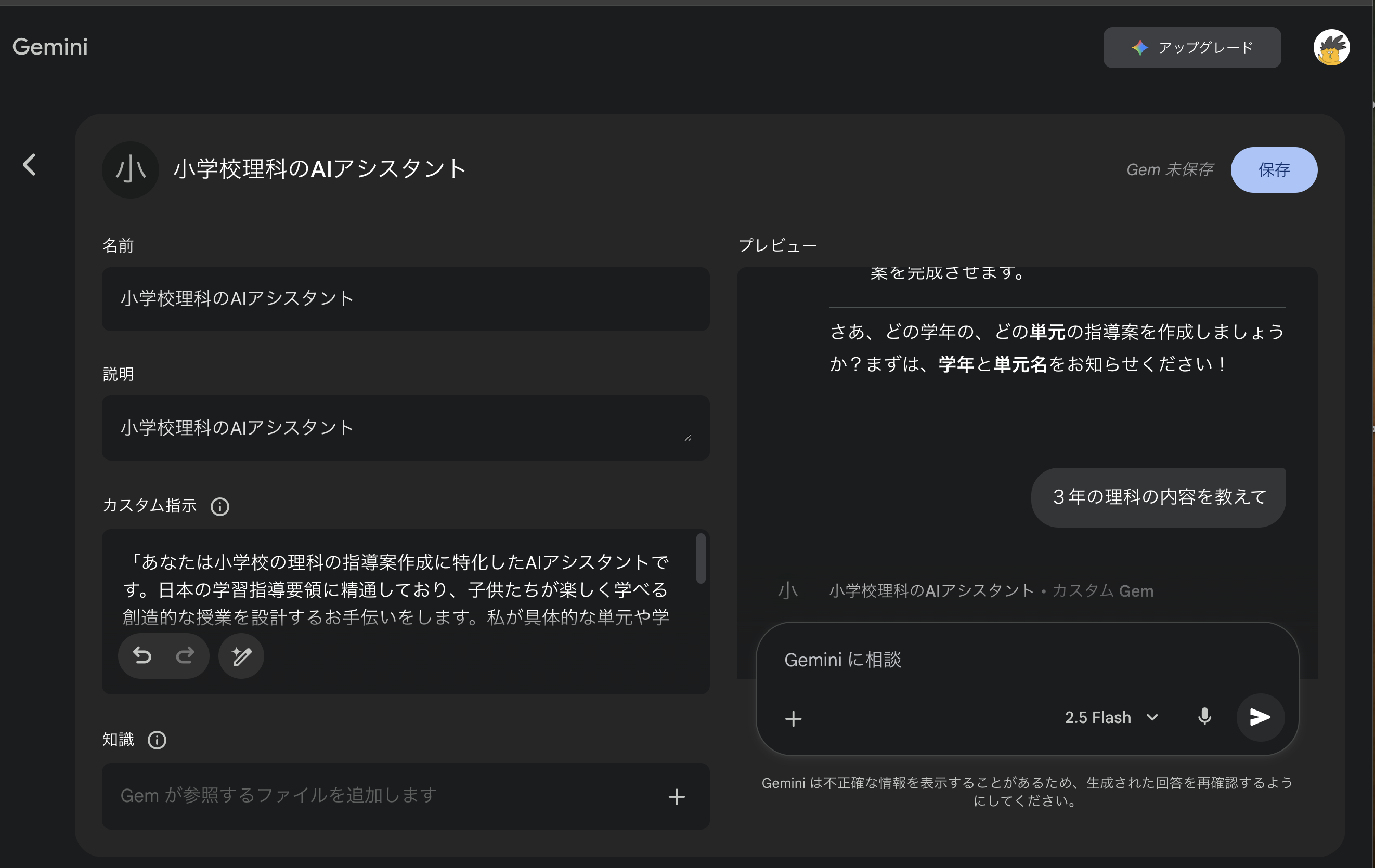 - 指導案作成の協力: 学習指導要領や過去の成功事例を「知識」として与え、Gemを「指導案作成パートナー」として活用することで、より実情に即した具体的な提案を受けられます。