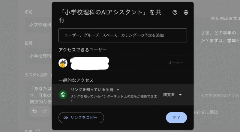 Gemは、個々の先生が利用するだけでなく、職員間で共有することで、その価値を大きく高めることができます。共有はGoogleドキュメントと同様にリンク形式で行われ、特定の個人、Googleグループ、または組織全体でアクセス権を付与できます。