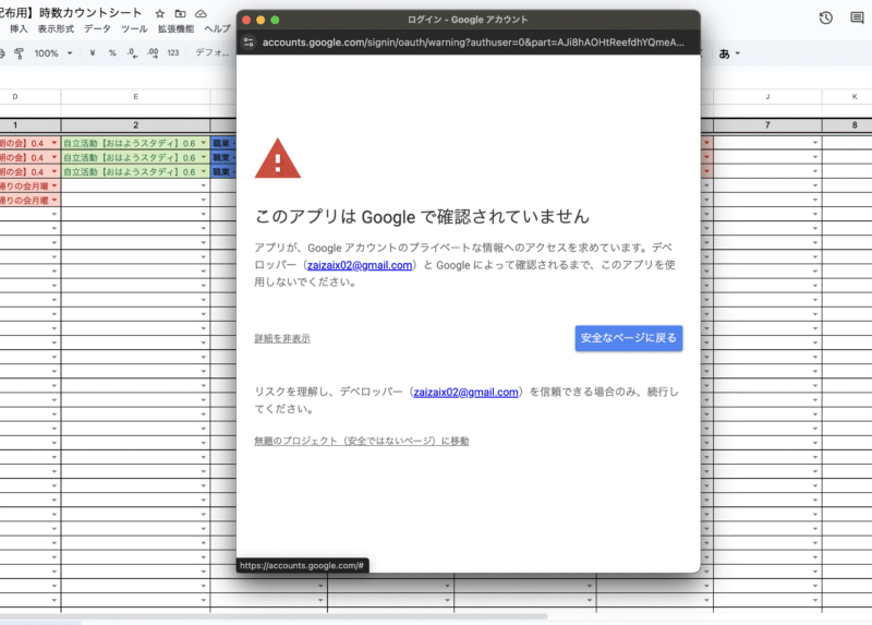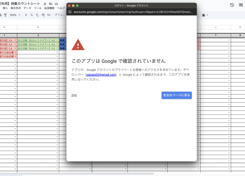 ここで、「Googleによって確認されていません」という警告画面が表示されることがあります。これは、私が開発したスクリプトがGoogleの公式ストアに登録されているアドオンではないためです。このメッセージは、スクリプトに問題があるという意味ではありませんので、ご心配なく。