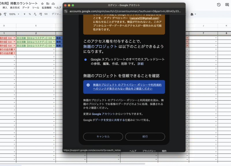 コピーしたGoogleスプレッドシートは、あなたの作業を効率化するGoogle Apps Script (GAS) のスクリプトが埋め込まれています。しかし稼働させるためにはひと手間必要です。この記事を参考に自分のパソコン環境で稼働できるように認証を行ってください。
