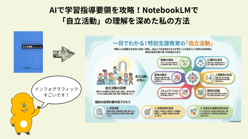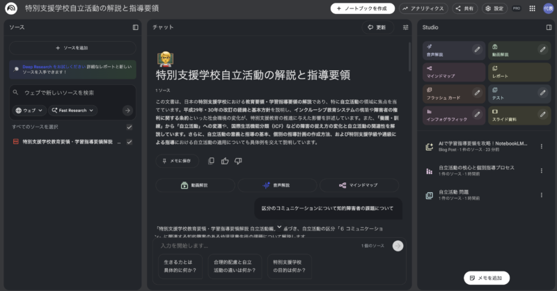 「特別支援学校教育要領・学習指導要領解説」のような専門的で複雑な文書を扱う私たち教育者にとって、NotebookLMのようなAIツールは、間違いなく強力なサポーターとなります。