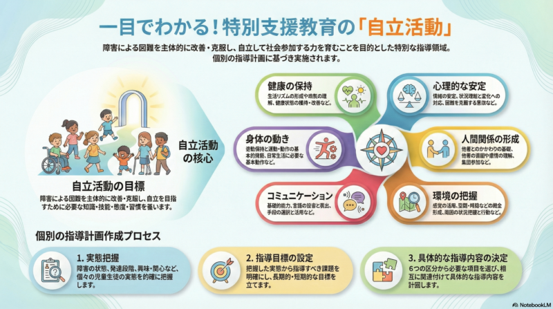 本題に入る前に、基本をおさらいしておきましょう。「自立活動」とは、特別支援学校の教育課程において、各教科や特別活動とは別に設けられた、特別な指導領域です。