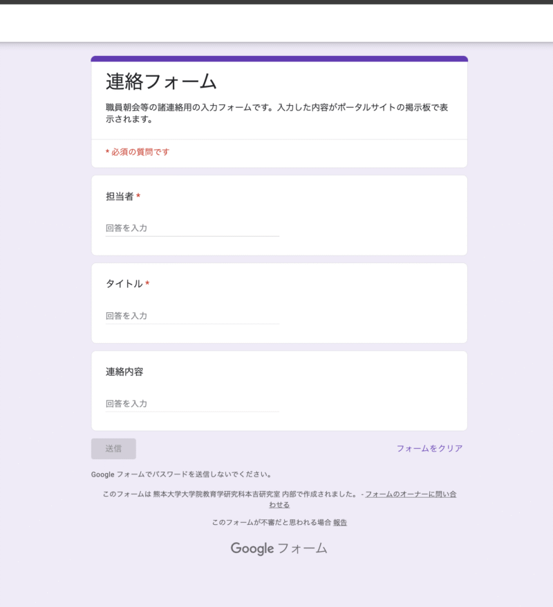 まず、先生方が連絡事項を入力する「入り口」となるフォームを作成します。