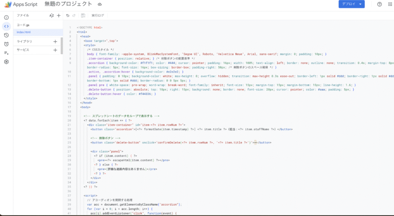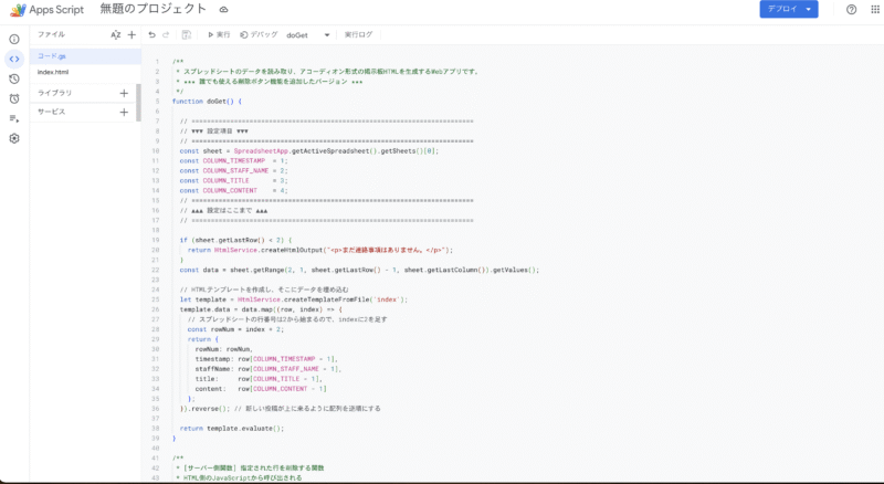 - GASエディタが開いたら、2つのファイル(コード.gs と index.html)を準備します。