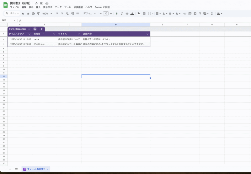 新しいタブで、フォームと連携したスプレッドシートが自動で開きます。このスプレッドシートが、掲示板のデータ元になります。これで土台の準備は完了です!