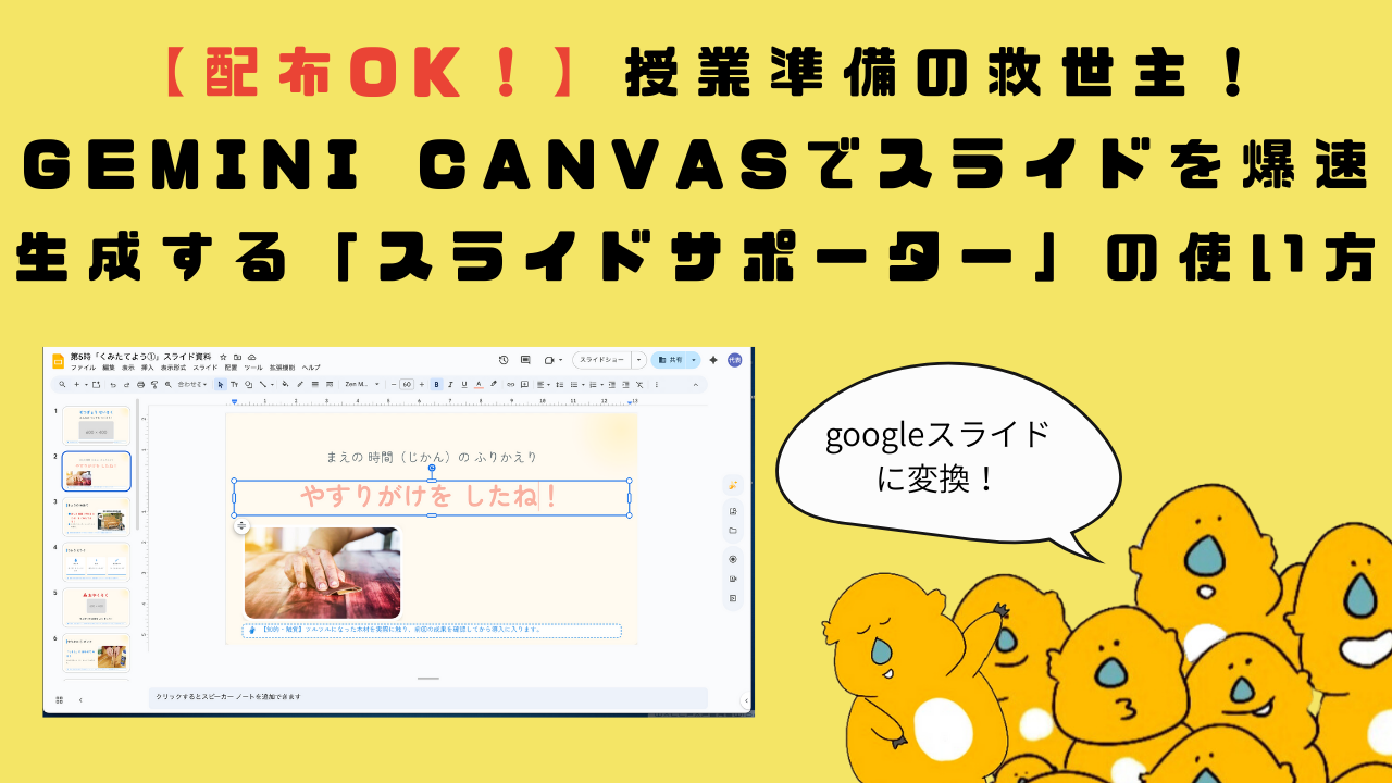 今回は、そんな先生方の強力なパートナーとなるカスタムGem**「スライドサポーター(通称:スライドおたすけくん)」**をご紹介します。Geminiの最新機能「Canvas」を活用し、対話だけで授業用スライドを作成・編集できる画期的なツールです。