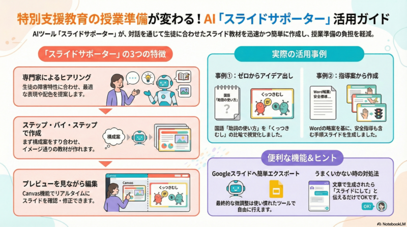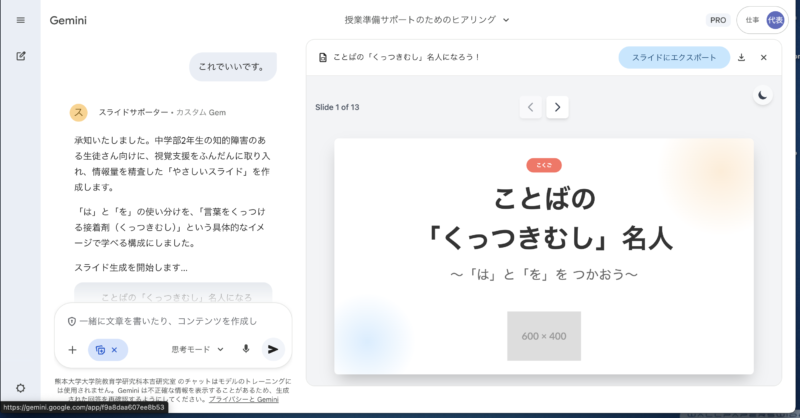 「スライドサポーター」は、Geminiのカスタム機能のGemとCanvas機能を組み合わせて作成した、特別支援教育の専門家という人格を持ったAIパートナーです。