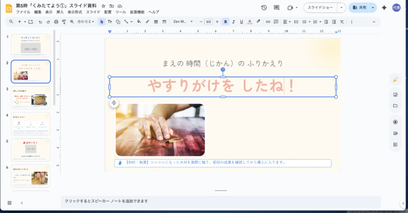 めあて、道具の紹介、手順が大きく表示され、教室のプロジェクターで映すのに最適なスライドがあっという間に完成しました。