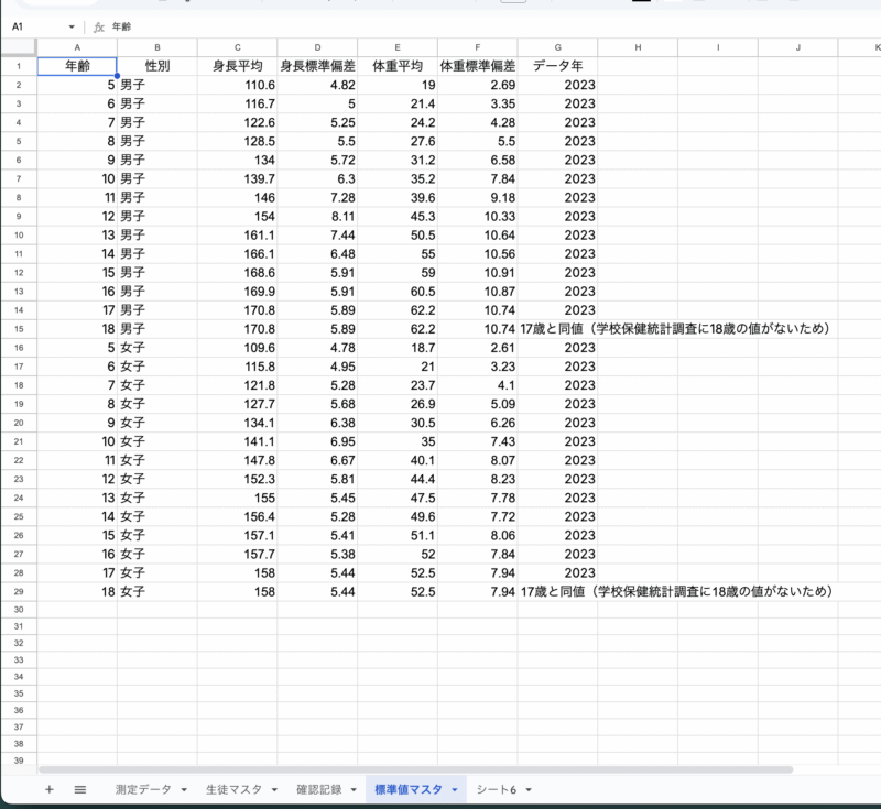 - 標準値マスタ: 発育アドバイスの精度を高めるため、文部科学省等の公的統計データを格納します。(後述文章参照)
