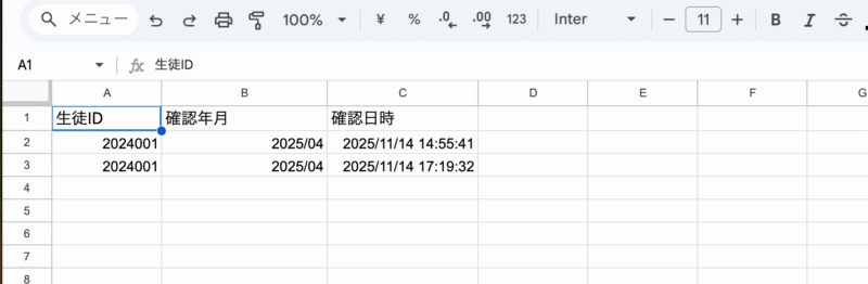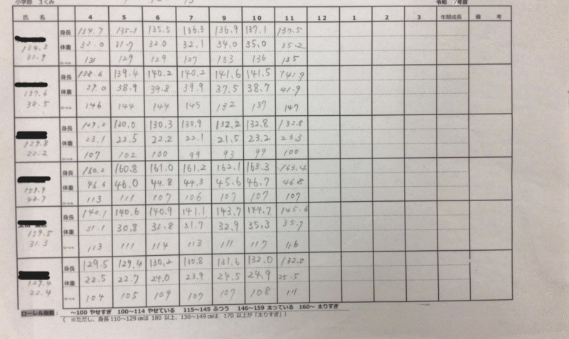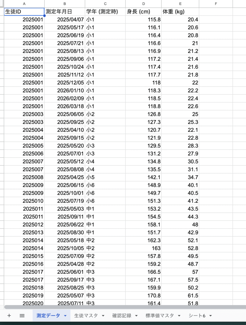 - 測定データ: 生徒IDに紐づけて、測定年月日ごとの身長・体重を時系列で蓄積します。(下図参照)
