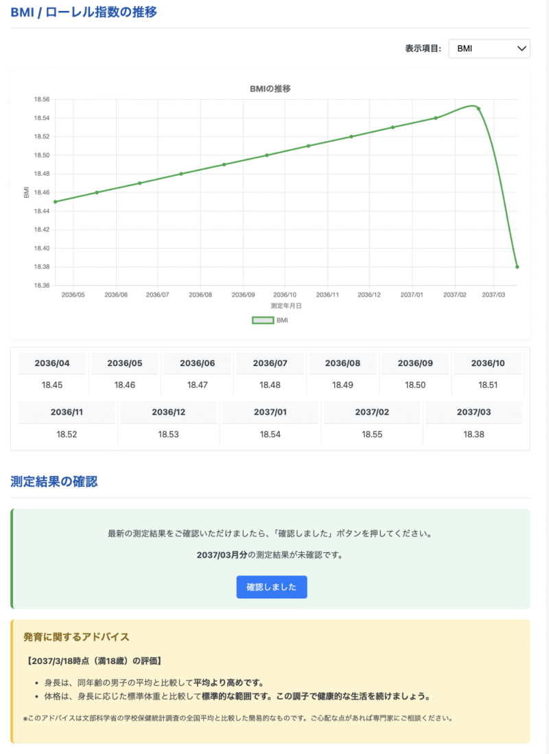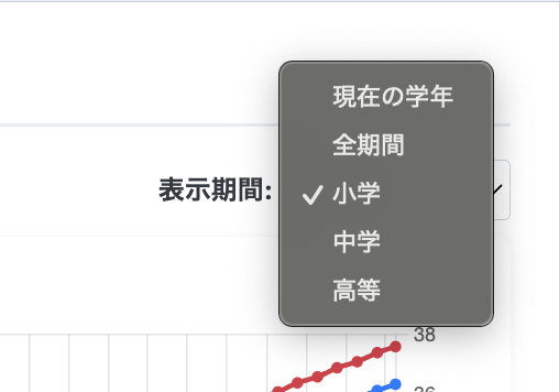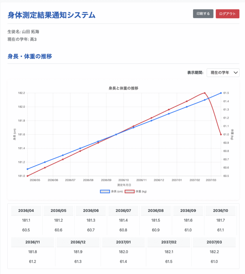 - 柔軟なデータ集計: JavaScript内に、選択された期間に応じて集計単位を切り替えるロジックを実装しました。「現在の学年」なら月ごと、「小学」なら学年ごとの前期・後期、といったように、ユーザーの意図に沿った形でデータを加工して表示します。この際、単なる平均値ではなく、期間内の「最後の測定値」を代表値として採用するなど、現場のニーズに合わせた細かい調整を行いました。