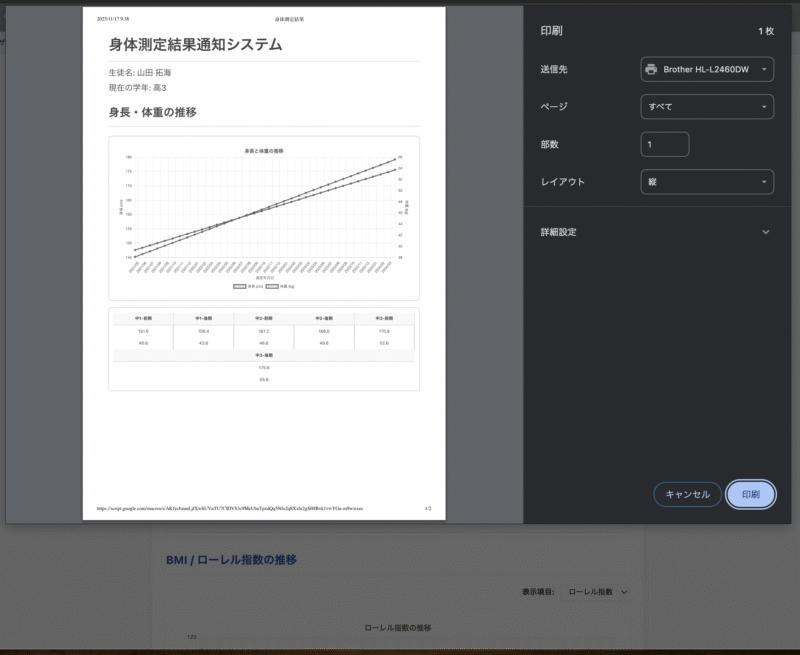- 記録の保存: 「印刷」ボタンを押すと、表示されている画面をA4用紙に適した形式で印刷できます。大切な成長の記録として、ご家庭で保管することができます。
