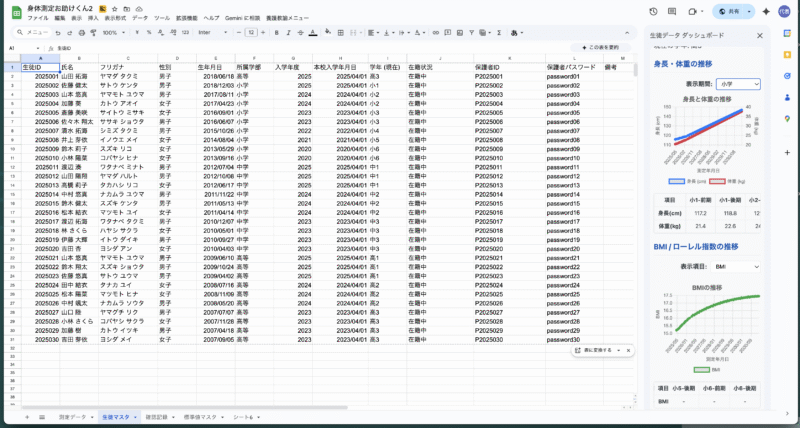 - データ入力: 毎月の身体測定後、「測定データ」シートを開き、生徒ID、測定日、身長、体重の値を追記します。タブレット端末から入力すれば、測定しながらリアルタイムで記録が可能です。