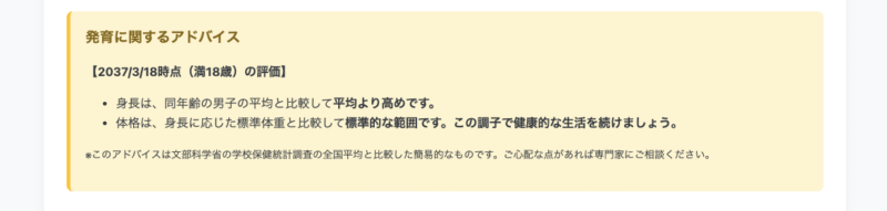 - 詳細な評価の閲覧: グラフの下には、全国の同年齢の子どもと比較した客観的な発育アドバイスが表示され、成長のペースをより深く理解するのに役立ちます。